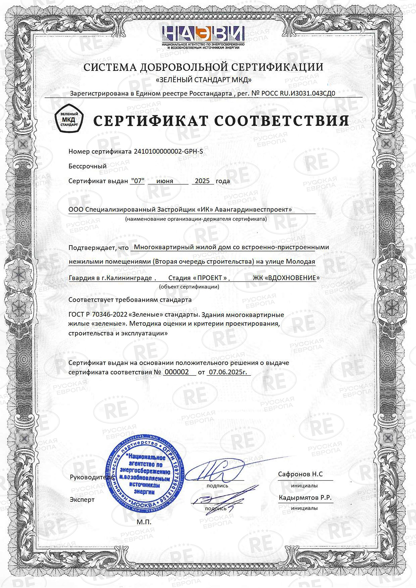 Вторая очередь строительства ЭКОквартала «Русская Европа», жилой комплекс «Вдохновение» в Калининграде стал первым объектом региона, удостоенным престижного сертификата соответствия по системе добровольной сертификации «Зелёный стандарт МКД»